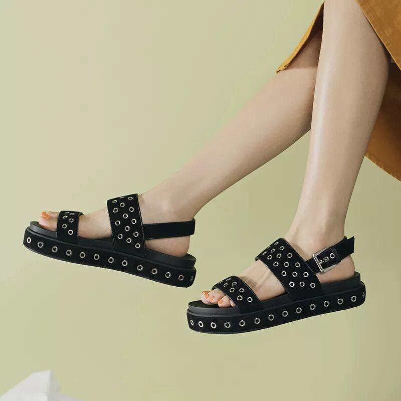 在凉鞋中加入铆钉的设计,在浪漫的设计中加入强悍的铆钉元素极具个性和创意,用一双黑色的鞋子来搭配黑白的经典造型低调中透着时尚的气息,黑色凉鞋对双腿的延伸效果令整体的身材比例都更加完美,你可以进店选择你的尺码。