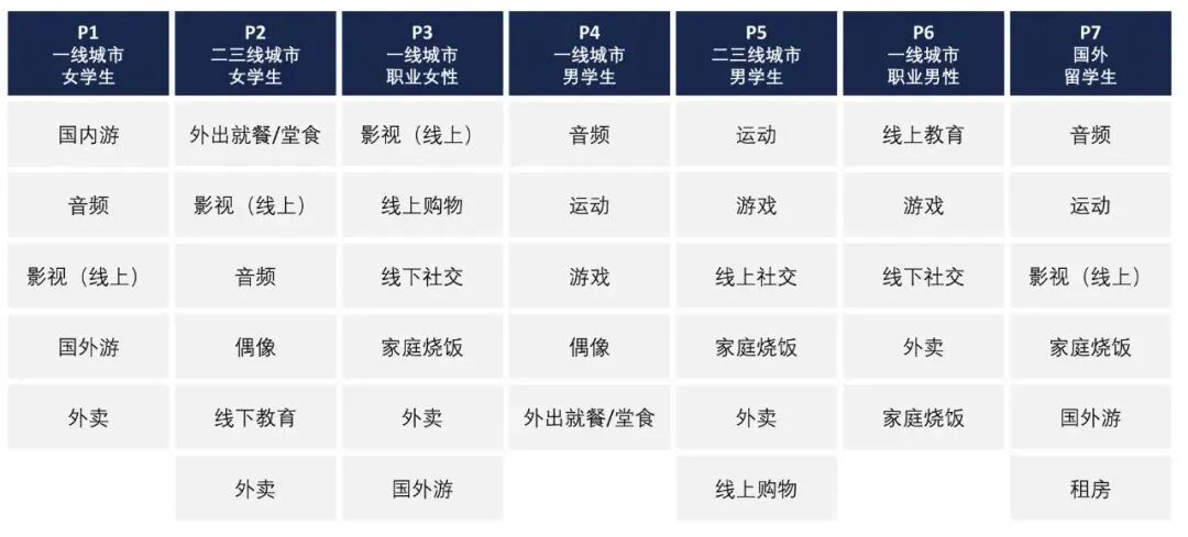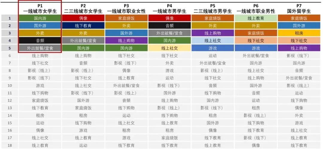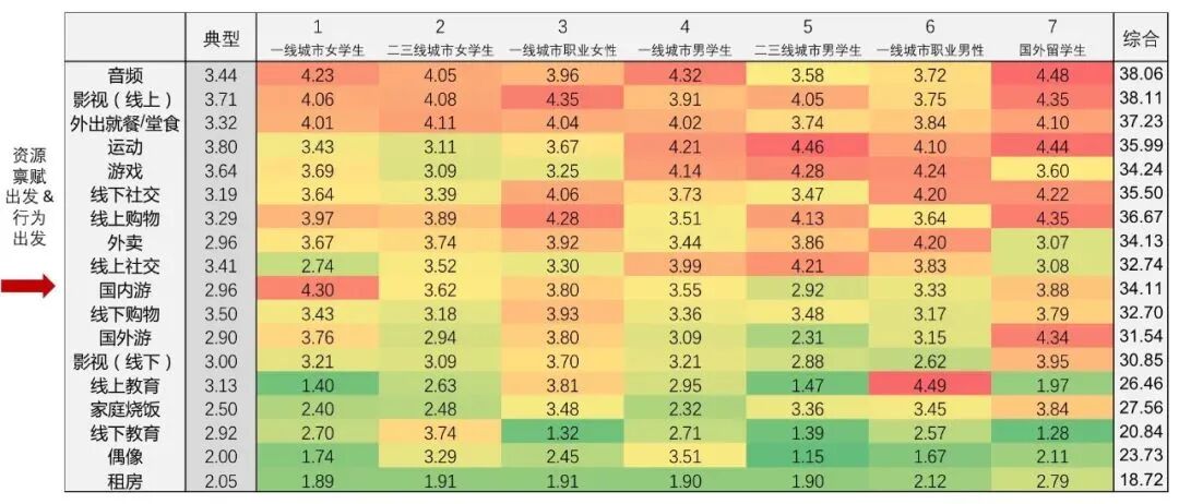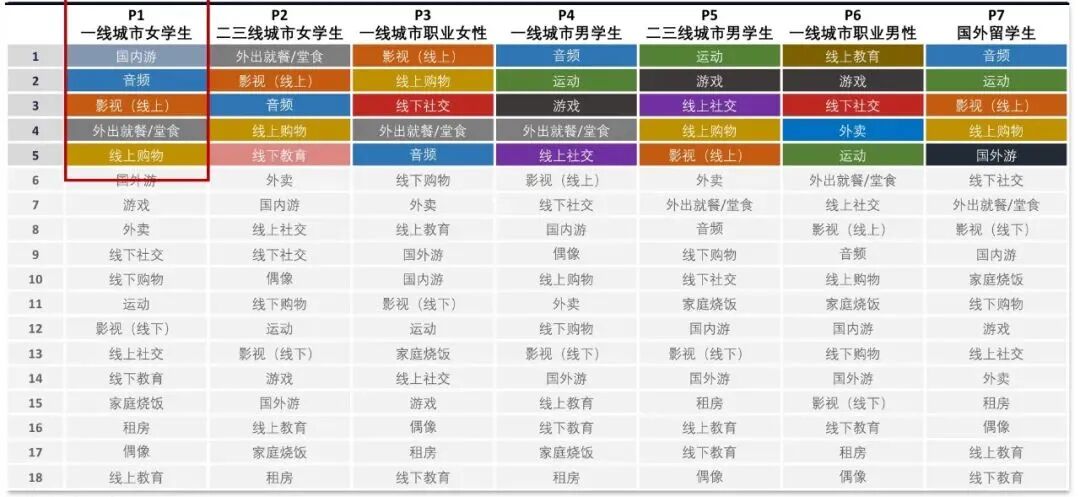 按照不同的商业价值计算结果,我们将一个具体人群的不同消费行为做了排序。如果有创业者想要优先切入人群入口,这张图则可以按图索骥。比如一线城市女学生,所有消费特征里面,国内游和音频是排在最前面的两项。