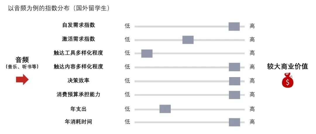 比如音频行为,最具商业价值的人群是国外留学生,其次是一线城市的男学生。