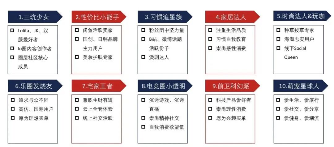 这十个典型的人物角色是我们根据真实的调研数据汇总抽象聚类得到的。经过整合之后,我们会发现单一的基础标签划分的细分人群会有比较鲜明的特征。
