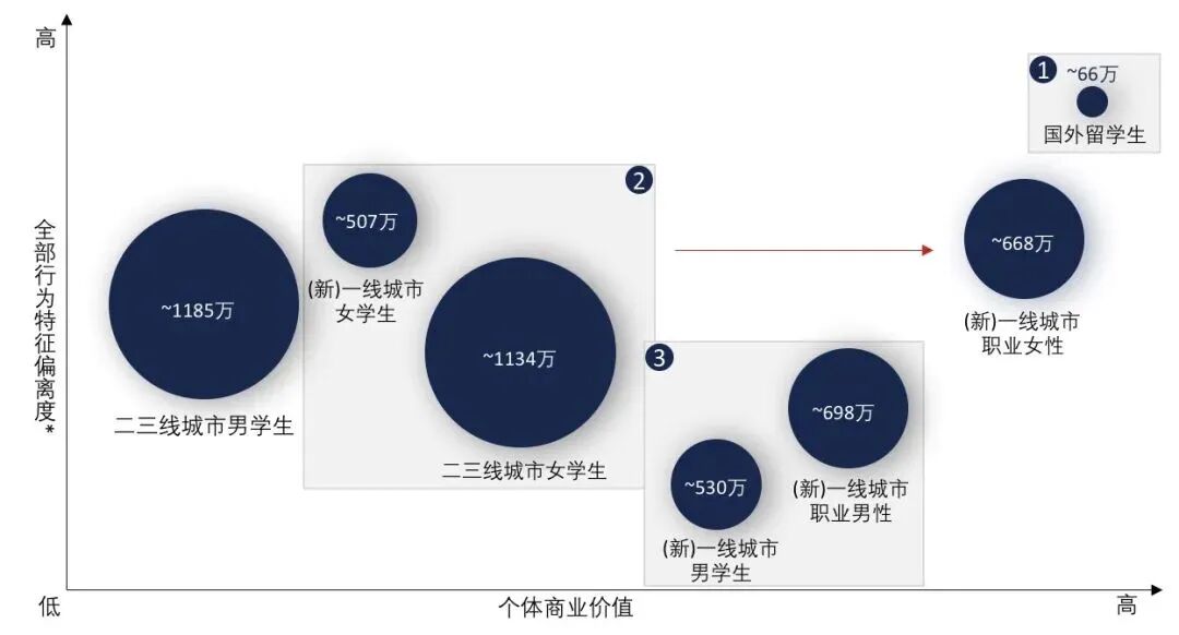 所以这张图有三个结论:国外留学生个体商业价值大,但人群基数小导致总体商业价值有限;女学生进入职场后,有了经济收入,其商业价值会有一次飞跃;(新)一线城市男性的消费特征与典型人群最相近。