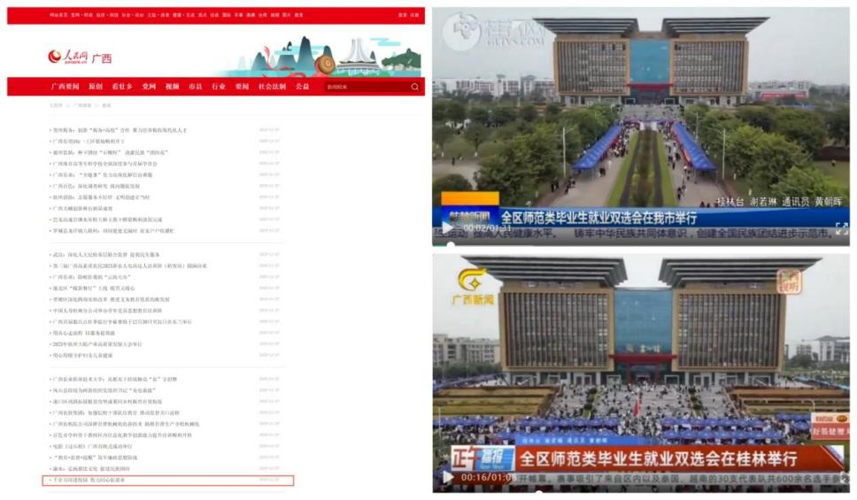 人民网等多家媒体关注报道在我校举行的全区师范类双选会。由自治区教育厅、自治区人社厅、自治区国资委主办,广西师范大学承办的2024届广西师范类毕业生就业双选会(桂林专场)在广西师范大学雁山校区图书馆成功举办。校党委书记贺祖斌亲切地向毕业生了解投简历的情况,并与用人单位深入交流。人民网广西频道、广西网络广播电视台、桂林广播电视台等媒体关注报道在我校举行2024届广西师范类毕业生就业双选会(桂林专场)。