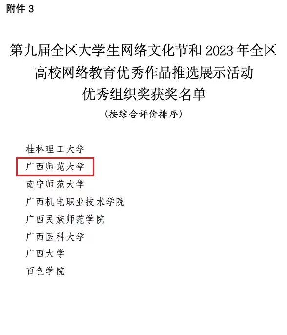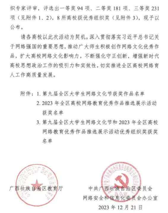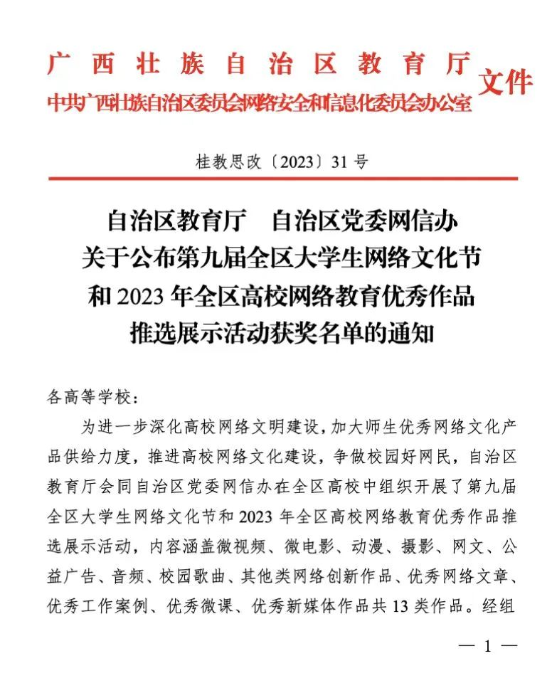 我校在第九届全区大学生网络文化节活动和网络教育优秀作品推选展示活动中喜获佳绩。近日,根据自治区教育厅下发的《自治区教育厅自治区党委网信办关于公布第九届全区大学生网络文化节和2023年全区高校网络教育优秀作品推选展示活动获奖名单的通知》,我校共有30项作品获奖,其中一等奖11项、二等10项、三等奖9项,学校荣获优秀组织奖,获奖数再创新高。