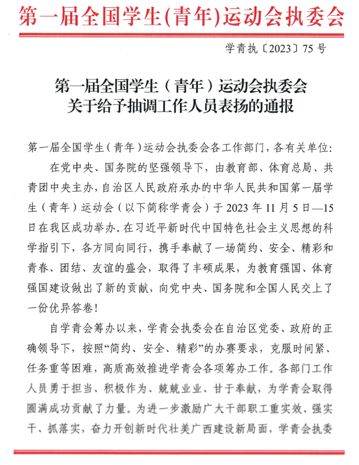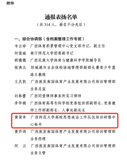 我校学工部(处)黄荣幸同志作为工作人员喜获学青会通报表扬。近日,广西师范大学作为赛事承办单位受第一届全国学生(青年)运动会执委会(以下简称执委会)通报表扬,随后,广西师范大学高校思想政治工作队伍培训研修中心秘书黄荣幸同获执委会通报表扬,对其在中华人民共和国第一届学生(青年)运动会(以下简称学青会)筹办期间深入细致的服务和专业出色的工作表示充分肯定。