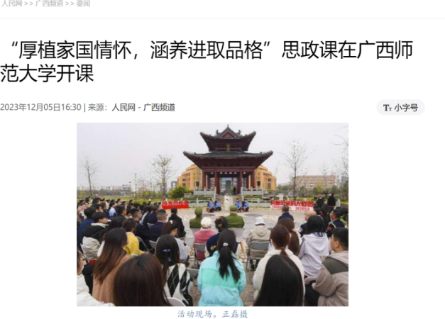 人民网等多家媒体报道我校首场“独秀思政课”。近日,由自治区党委党史研究室、广西广播电视台和广西师范大学联合策划,广西出入境边防检查总站特别支持的“厚植家国情怀,涵养进取品格”纪念抗美援朝胜利70周年“独秀思政课”在雁栖湖杏坛顺利开讲。校党委书记贺祖斌出席活动并致辞,近1.3万名师生与广西出入境边防检查总站的民警代表线上线下同步参与学习。本场“独秀思政课”立意高远、内涵丰富,不仅收到高等教育领域高度关注,更引发10余家大众媒体和行业媒体报道:人民网、《中国移民管理报》、全国移民管理文联、光明网、广西壮族自治区教育厅、今日头条、广西卫视、广西财经、广西新闻频道、广西党史、八桂国门、广西师范大学官微等媒体平台纷纷报道“独秀思政课”。