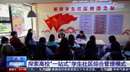 中央电视台新闻频道报道我校“一站式”学生社区综合管理模式。中央电视台CCTV-13新闻频道《新闻直播间》栏目以《广西 探索高校“一站式”学生社区综合管理模式》为题,报道广西高校“一站式”学生社区建设成果。其中,特别报道我校“一站式”学生社区综合管理模式建设工作。我校学生可以通过“一站式”学生日常管理服务系统,报名参加思政故事会、读书分享、艺术体验等活动,特别是国画、书法、篆刻等体验课程,更是受到非艺术专业学生的欢迎。