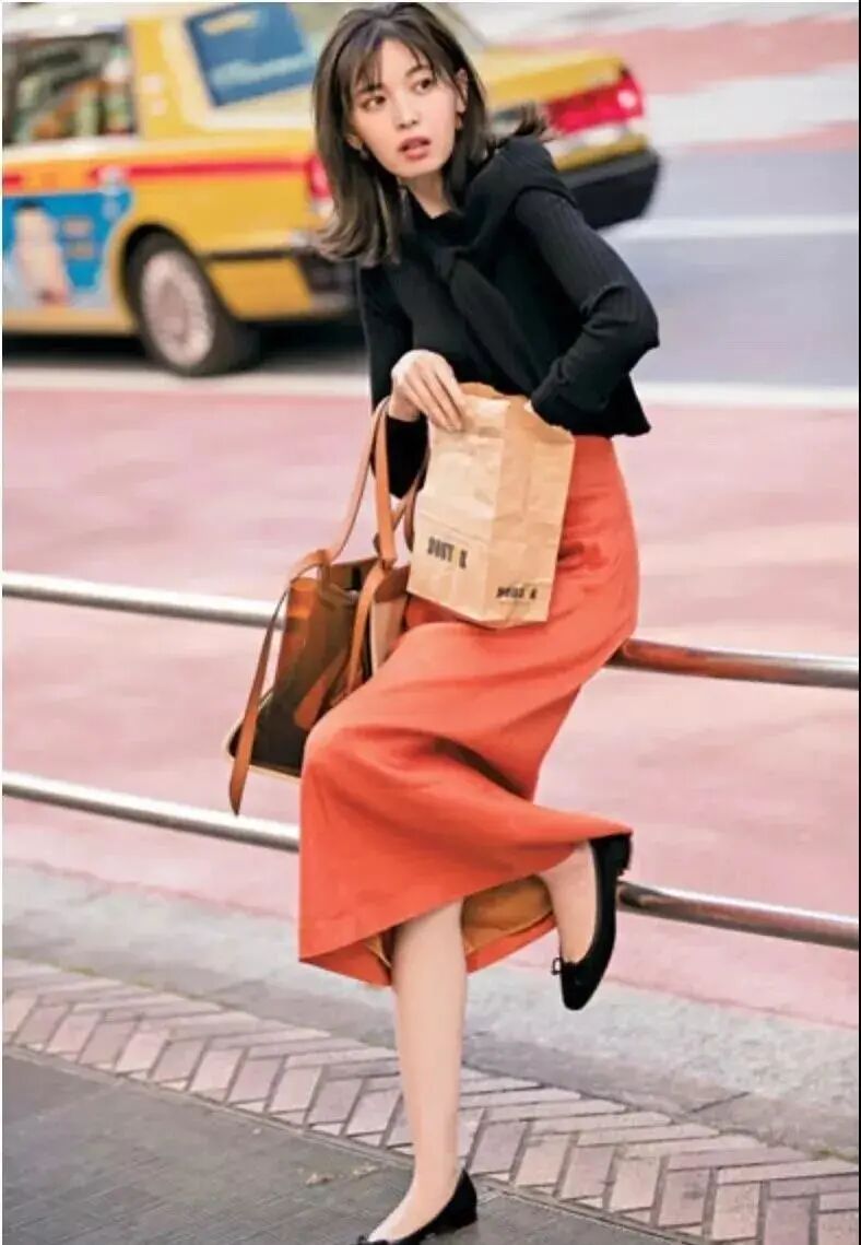 两件黑色针织衫叠穿,乍看不明显,细端却很时髦。搭配橘色半身裙,释放活力与耀目。