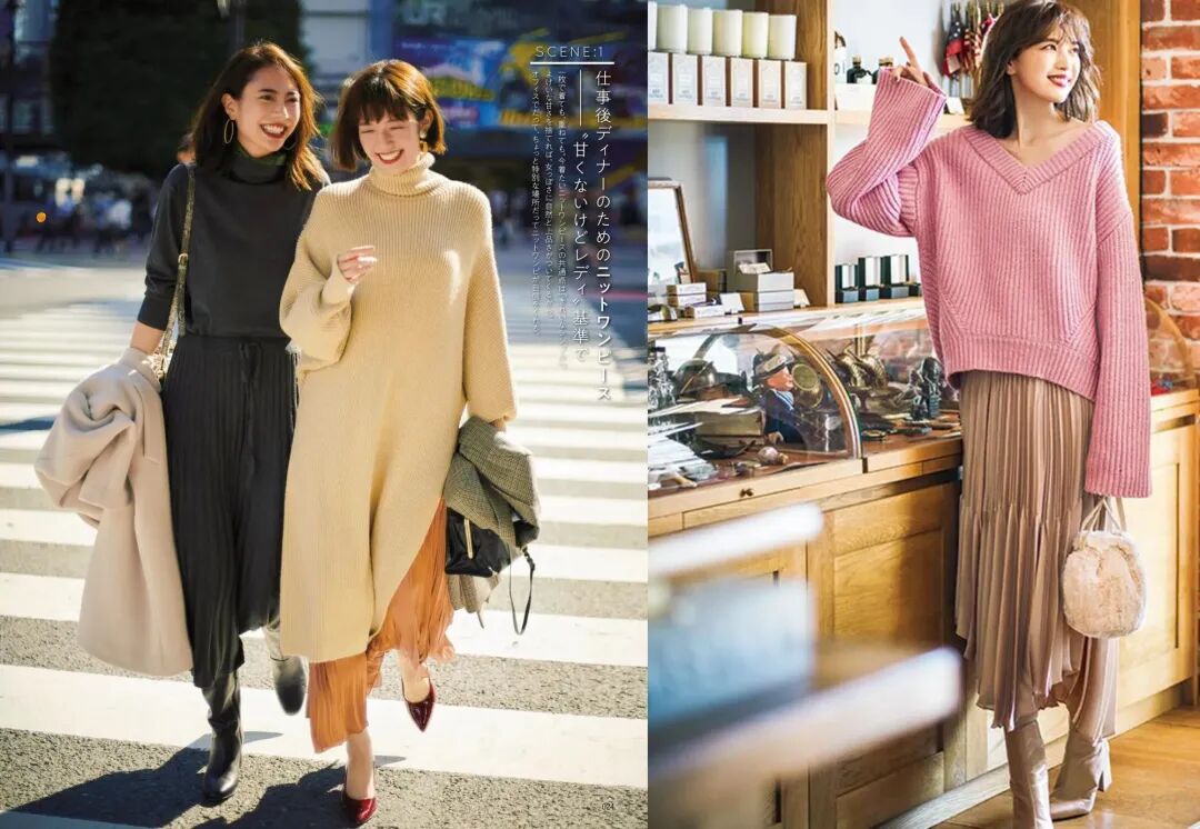 要点:毛衣裙要有个性,开叉设计、或有明显的设计亮点,内搭的半身裙要缎面或轻薄,总之不是针织材质。