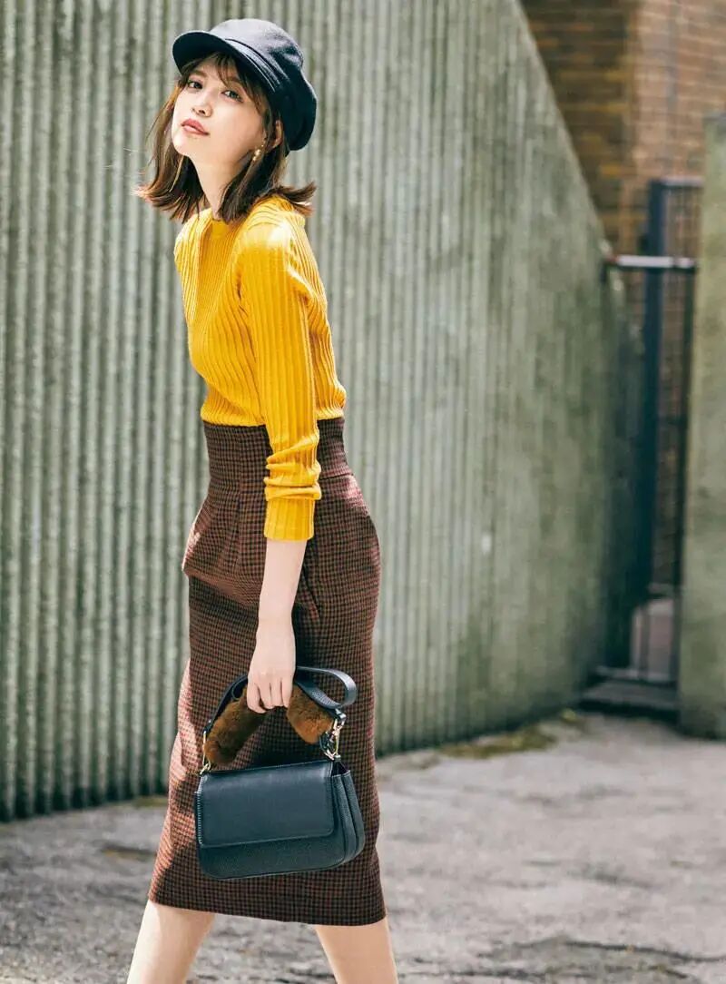 铅笔裙或修身包臀裙,与修身的毛衣配合,少了潇洒、多了成熟。对于职场达人,这类搭配很讨喜。选择同色系搭配,将高级感放大。