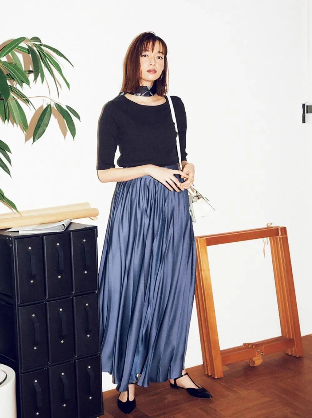 泛着明亮光泽的缎面半身裙,细碎的褶子间写满对质感与风情的诉求。飘逸而不生硬,华丽而不张扬,深浅有度的衣着里,是穿衣的分寸态度。↓