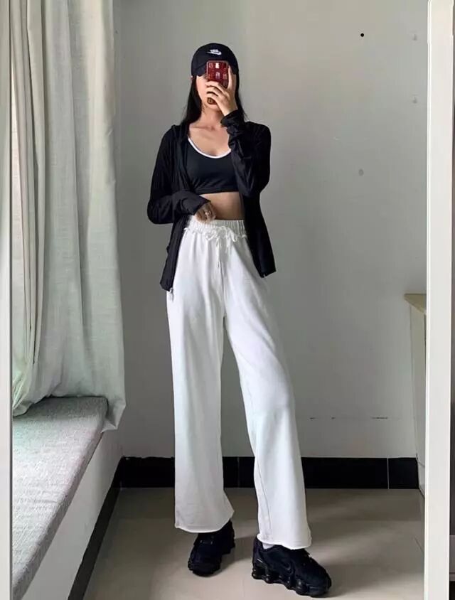 运动lo0k,吊带搭配阔腿长裤,全身黑的话可以搭配,夸张特别的运动鞋,增添休闲运动感