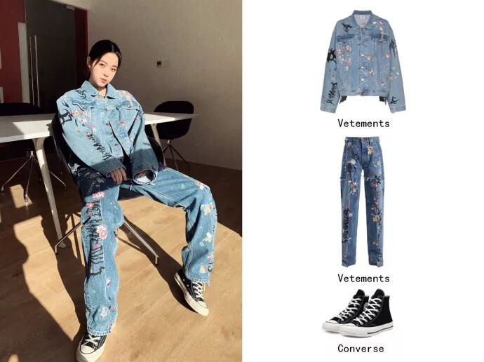 娜比这一身牛仔外套上面绣了一些印花,