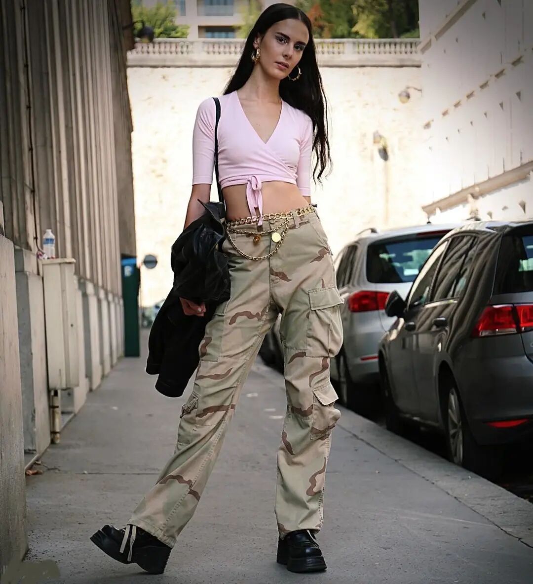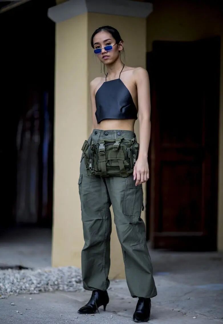 露腰上衣不一定非要是小背心,V领长袖的露腰上衣也是不错的。搭配一条绿色迷彩高腰工装裤,这裤子可以是阔腿裤的样子。越宽松越有范儿。不过这裤子还是有点挑人的。不适合个子矮的人穿。