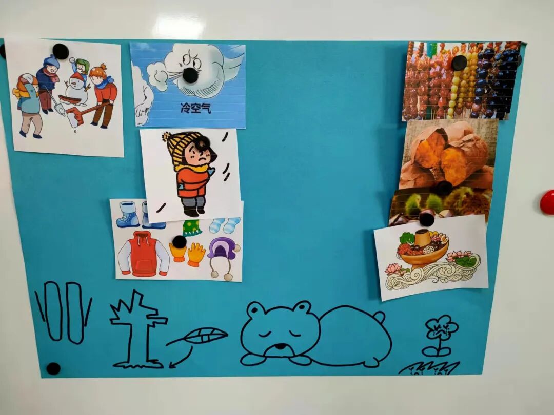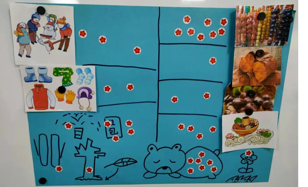 冬天所包含的事物很多,孩子们对冬天都知道什么?对冬天的哪个物品、事物更感兴趣?班级三位教师共同探讨,预设了冬天的一些事物的图片,在活动中孩子们如果说出对应事物教师张贴出,孩子们如果说出了教师未预设的事物便画出,最后以贴小红花投票的方式发现孩子们的兴趣。