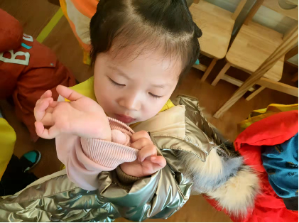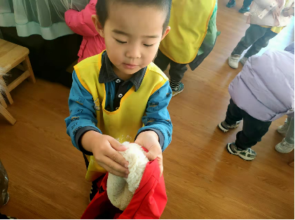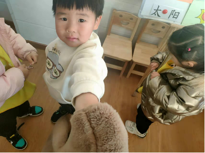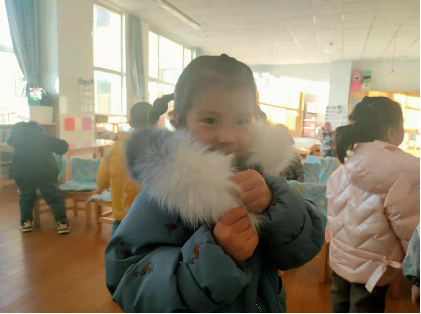 活动结束,我们在去户外穿衣又发现了孩子们依旧沉浸在课程里,穿上衣服不断的向我展示自己衣服里的毛毛。