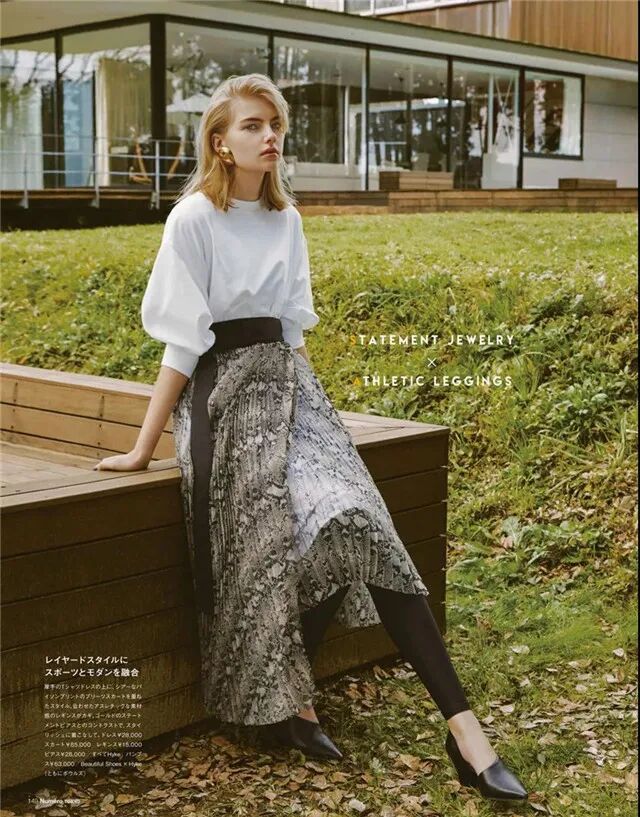 通过下面的穿搭我们可以看出来,裙子的开叉设计可以在前面,也可以在侧面,侧面开衩的设计是最百搭的,不容易走光,而且很好驾驭。