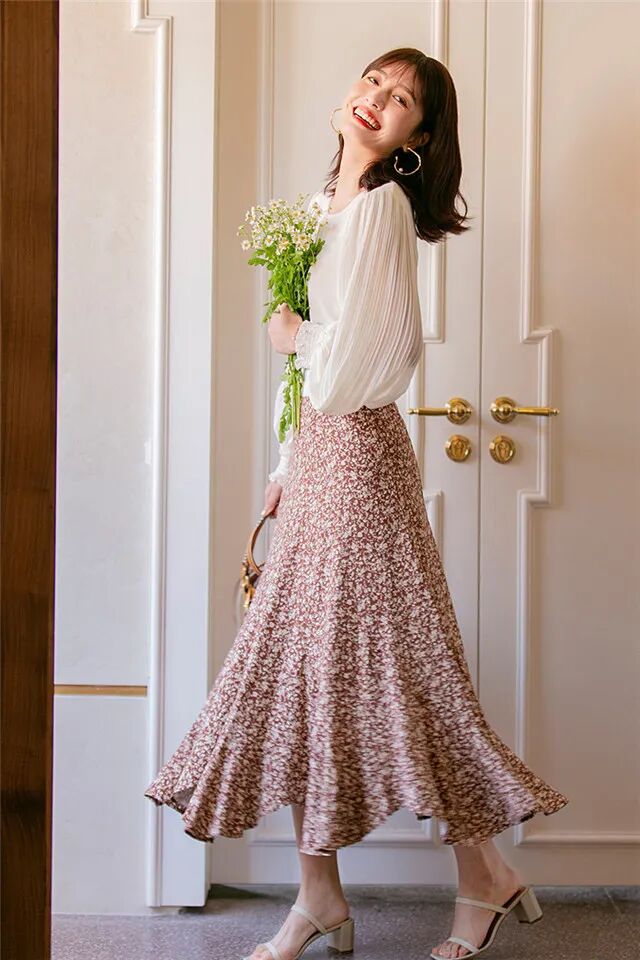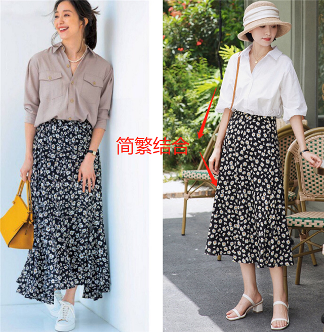 挑选裙子的话,我们有两种选择,一种是简单的纯色长裙,另一方面就是设计感很强的碎花裙,那么搭配的时候要注意咯,选择设计感比较强的裙子时,上衣就要简单一些,简繁结合搭配更时髦。