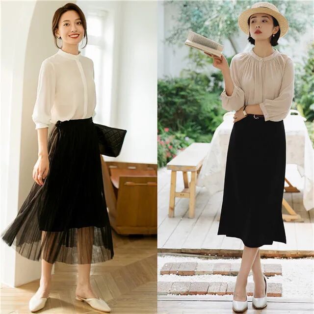 衬衫作为基础单品,在时尚圈之中的地位是很高的,比如我们可以借鉴下面的白衬衫搭配黑色半身裙,显示出优雅精致的感觉,职场搭配或者日常搭配都可以。