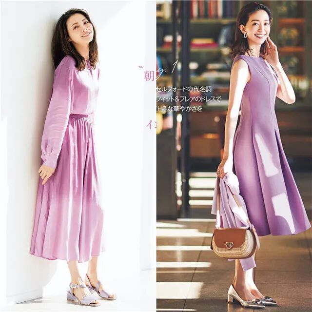 比如我们可以借鉴下面的时髦搭配,紫色连衣裙的搭配体现出了满满的女性魅力,结合尖头高跟鞋搭配起来,轻轻松松显高显瘦。