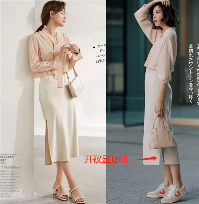 在选择裙子的时候,设计也是十分重要的,想要凸显出你的好气质,一定要注意细节的设计哦,比如我们可以加入开衩的设计,一方面可以增强设计感,另一方面可以修饰侧面的小腿曲线,达到显瘦目的。