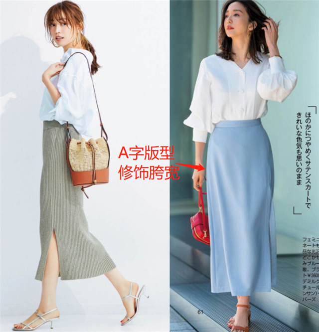 现在市面上的裙子有很多种类型,A字裙还是包臀裙,展现出来的风格都是不同的。针对想要显瘦的你来说,可以选择A字版型的半身裙,借助A字上窄下宽的设计来修饰胯宽和腿粗的问题,可以有效的达到显瘦目的。