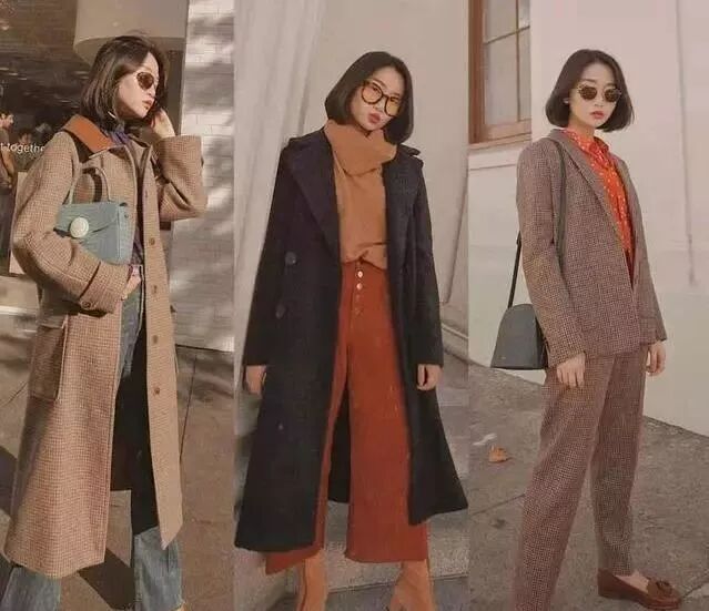 这种复古风的外套也是近几年比较受到大众欢迎的,卡其色的大衣搭配一件灰色的打底衣,看起来不会过于复杂,一条牛仔阔腿裤,也是当下比较流行的,这样一身搭配,就潮流又复古。而且像上图三的小姐姐这种咖色西装搭配橘红色碎花衬衣也非常的又复古感,可以上班穿也可以逛街穿,又飒又A 的,非常凸显气场哟。