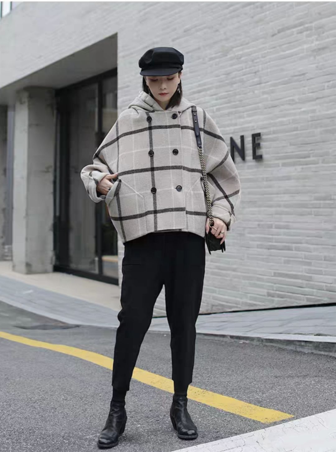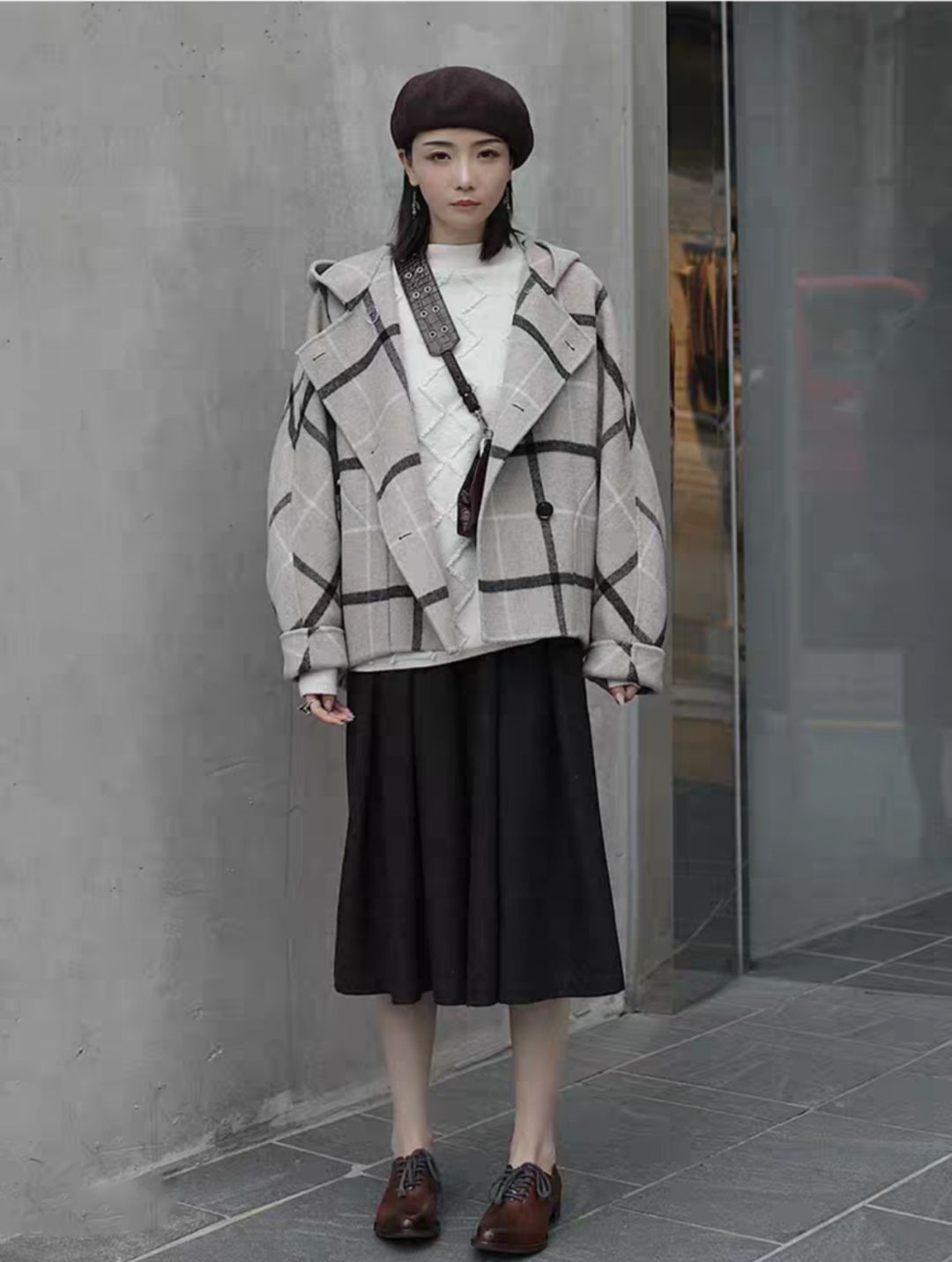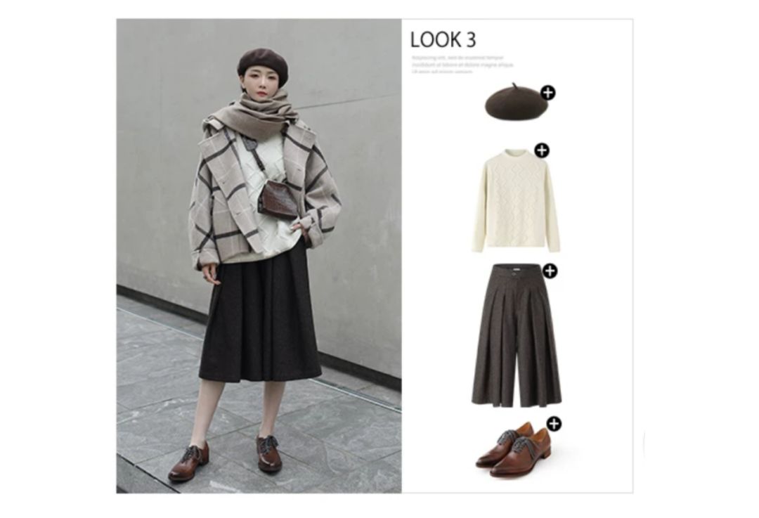 外套和毛衣都算是基础款大格子阔腿裤是亮点
