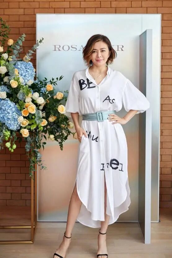 关之琳这件字母印花的衬衫款连衣裙,选择了白色简约高贵,加上轻纱雪纺质地的面料,轻盈柔美、仙气十足; 下摆不规则设计别致又增加了露肤度,秀出纤长美腿视觉更显瘦; 腰间用一条薄荷绿色缎面腰带,分割和勾勒出了高腰线,非常显瘦显腿长。