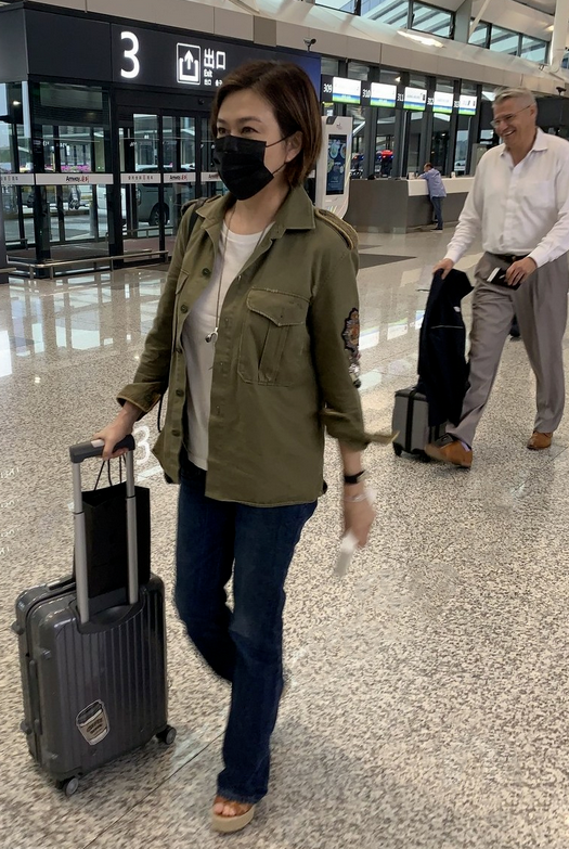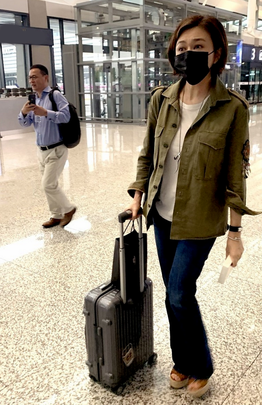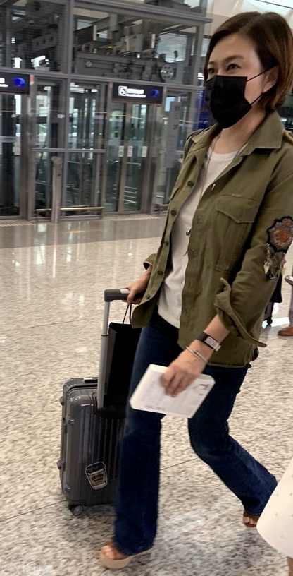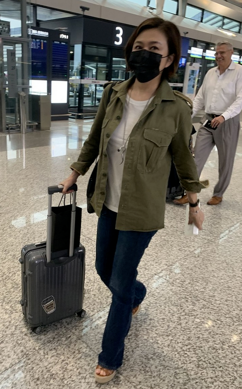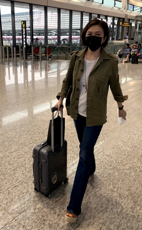关之琳在军绿色的衬衫内搭了一件白色简约T恤,无装饰无印花无点缀的极简款,附和着衬衫的中性感,协调统一,绿+白的配搭清新养眼,经典不出错。