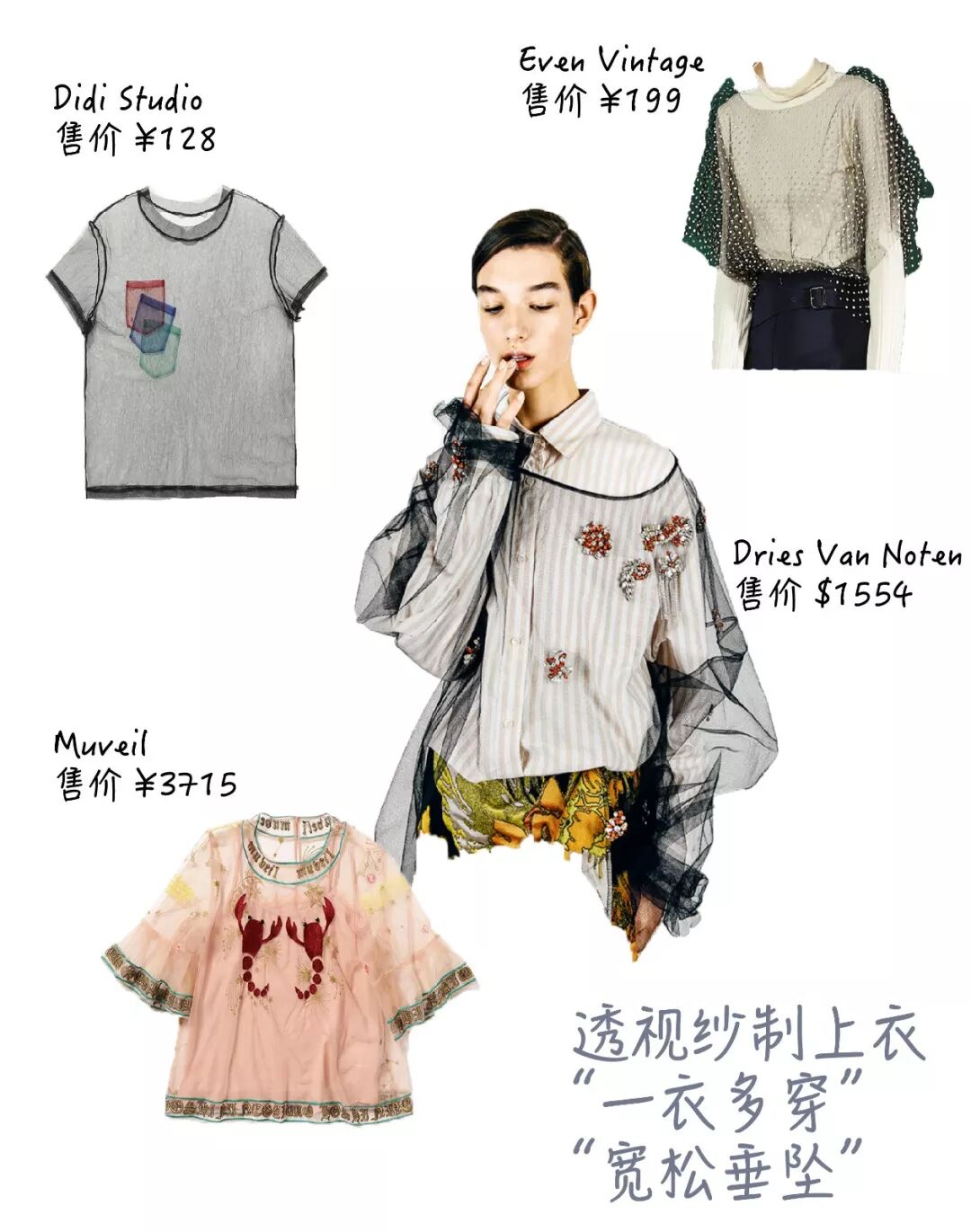 除了单穿的上衣外,也可以选择有透视效果的宽松外搭。材质的叠加和图案的碰撞能提升整体着装的质感。购买时要选择宽松有垂坠感的,这样更能营造出一种不怎么care就很时尚的effortless chic。