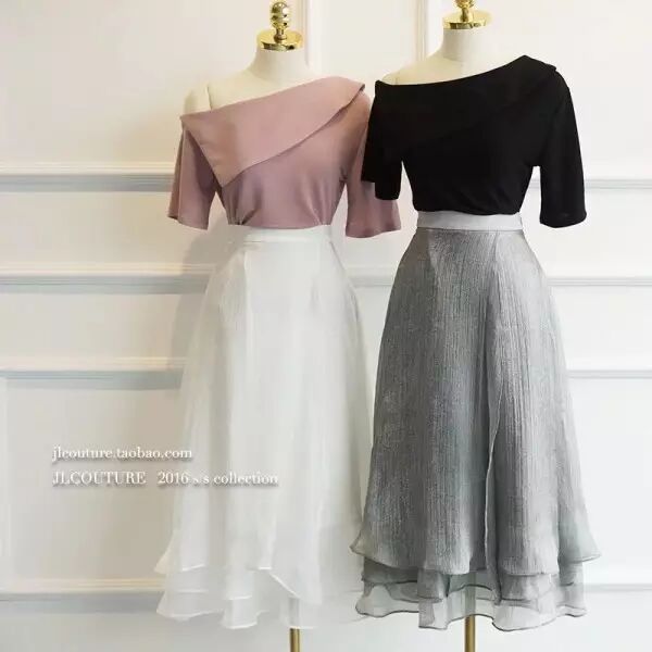 2. 这款银灰色高腰半裙要怎么搭配一个月前就入了这款裙子,类似欧根纱材质,银灰色,也有像图片上这样用黑色搭配过,不过是棉质的中袖一字领露肩上衣,效果不错,但感觉现在穿会有点热,麒麟臂背心穿不了,胸小且锁骨明显-_-#,看看友友们还有没有其他的建议,尤其是面料,颜色上。