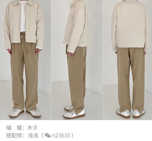 白色T恤作内搭配米色的短款外套,再搭上高腰西裤,这样的穿搭模式高级又街头风,适合比较年轻的男士。