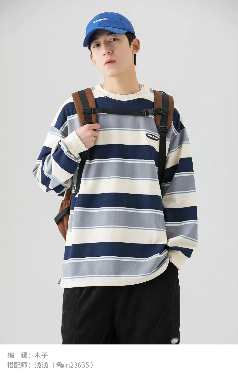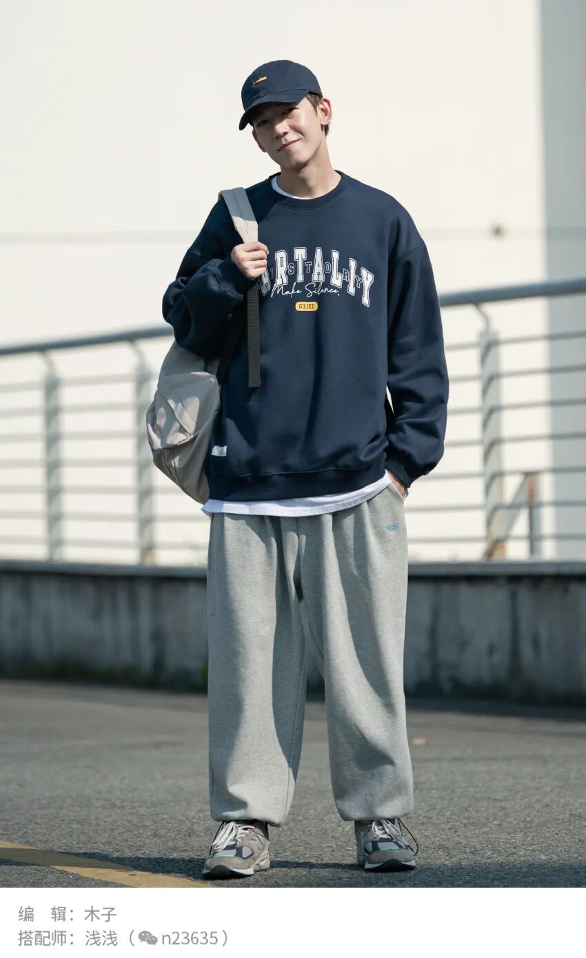 蓝色卫衣搭配灰色运动裤,利用白色T恤,在中间起到过度的效果,最后利用鞋子和包包颜色,起到上下点睛的效果。