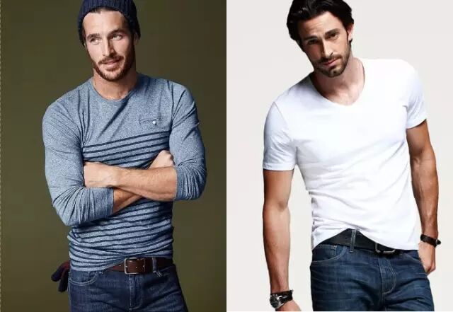 花了许多时间去健身房练出厚实的胸膛和臂膀,这种人人称羡的身材,在穿搭时可要小心倒三角给人头重脚轻的错觉。在上半身的挑选上,可以使用胸部以下有条纹的单品,来增加腰部的横向视觉,而T-shirt则是选小V领来修饰胸肌。