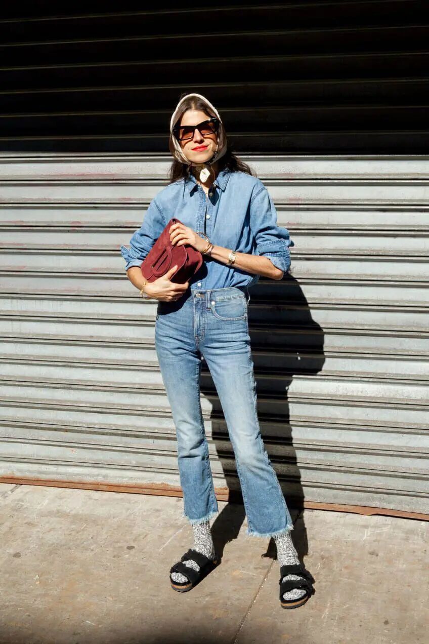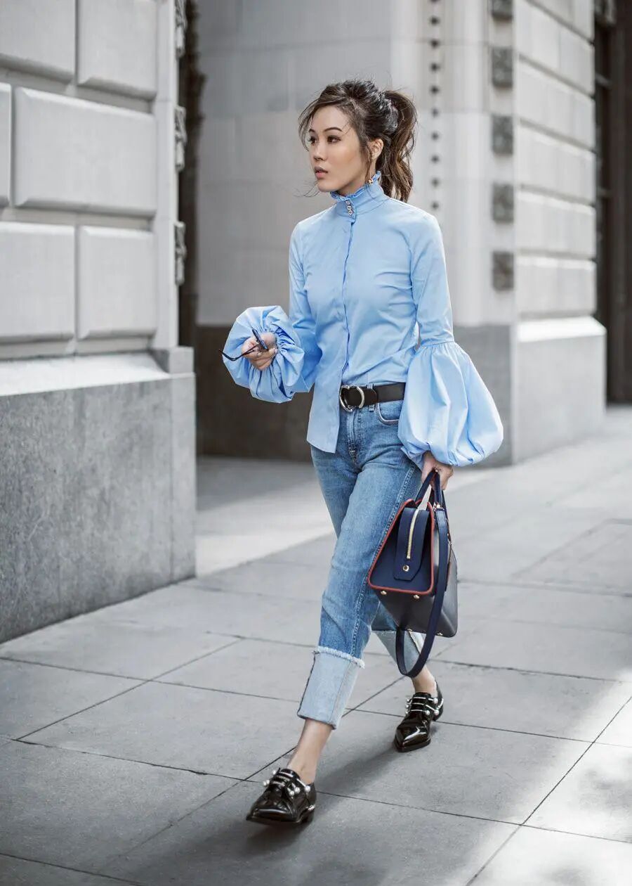 都说牛仔裤很好搭,那也得看款式和身材啊,这种紧身的牛仔裤踩雷率就相对比较高了,所以要重点考虑你适不适合再来安利。如果你是细腿又高挑的女同学,那我强烈建议你选这样的紧身裤配蓝色衬衫,但如果身材不是那么完美就另当别论了。