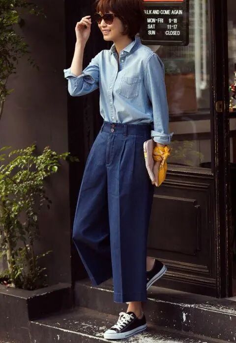 2、阔腿牛仔裤配蓝衬衫百搭能遮肉