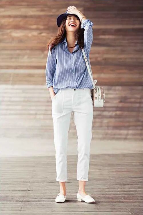 这一件蓝色的竖条纹衬衫,颜色属于浅色系的,看起来比较清纯,搭配一条白色的西装裤看起来单薄又纤细,一般这样穿都错不了,九分裤款露出脚踝部分,搭上一双平底鞋不会被遮住亮点,加上一个小包包作饰品,整体造型很perfect!