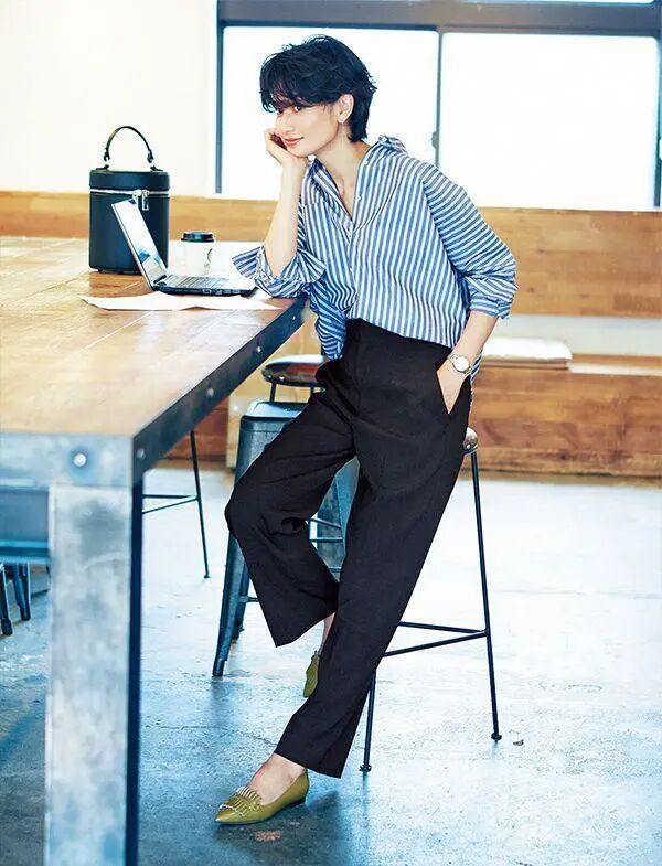 想要搭配出精致的职场女性范,我建议你选择这一套。黑色西装裤高腰设计,颜色不挑人,这种款型也很显瘦,竖条纹衬衫时尚颜色较深,上衣半扎到裤子里增加特色感,配上一双绿色平底鞋,这样穿不用再担心会成为病号造型了。