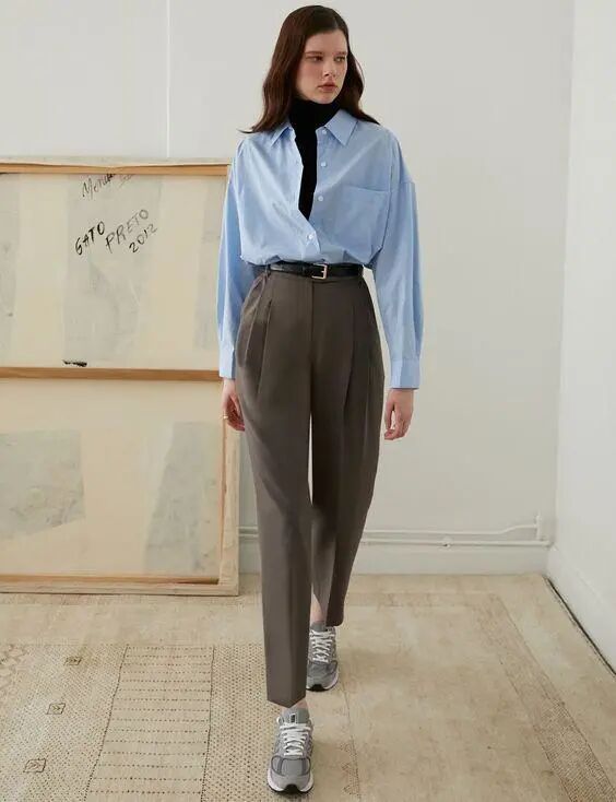 蓝色衬衫很好搭,用作叠穿有层次感又不单一,一条高腰的深灰色西装裤,既提高了腰线,又拉长了腿型,还能修饰腿部,这样的裤子真的是神仙款式啊,配上叠穿的衬衫套装,这样的搭配春日必备,加上运动鞋,妥妥的霸气少女。