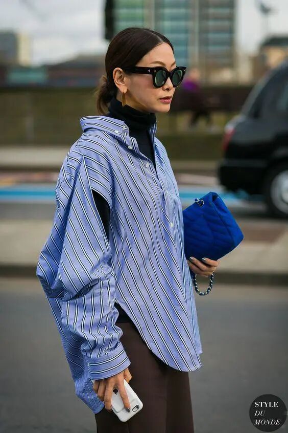 蓝色衬衫比白色衬衫更容易穿出休闲感,蓝色能够呈现不一样的知性魅力,合理的搭配技巧极其关键,选对让你秒变国际范,轻松就能够提升时尚度和光感,加上一些小配饰只能说整体造型绝对不差强人意。