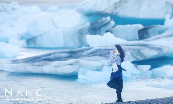 冰岛的杰古沙龙湖,温度七度左右,风特别大。小伙伴勇敢的脱了外套冲到这里,整套衣服浅蓝深蓝的同色系搭配,跟背景颜色完美贴合,再加上风吹动起来裙摆!完美!!