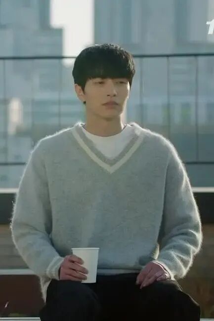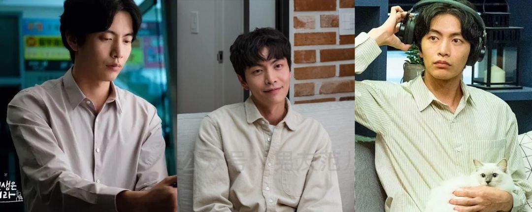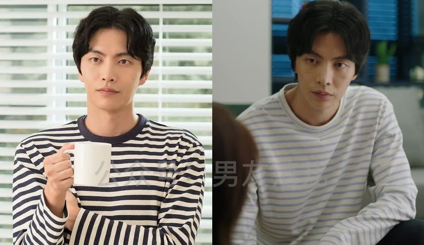 这部剧的男主也是朝九晚五上班族,男主李民基是一个背负房贷压力、对感情很克制的形象,他的穿搭就像人物性格一样,写满了极简主义。这种黑白、灰白细条纹T恤很简单大方,轻熟男生不想要图案T的话,可以考虑这种条纹装饰。