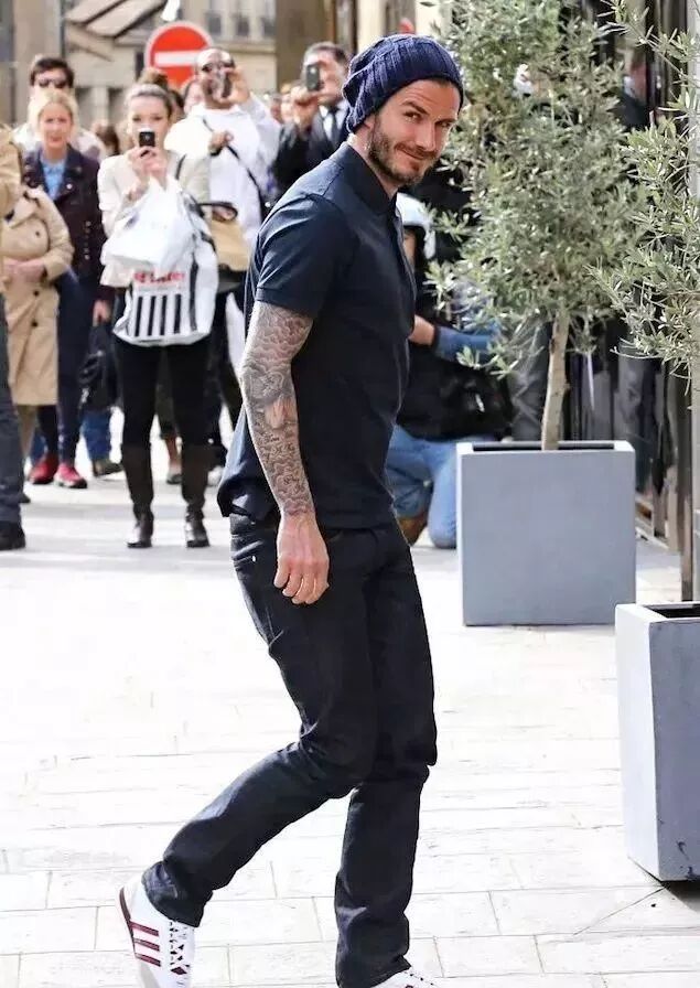 顶着时尚男神头衔的超级球星小贝,穿了件黑色POLO衫,搭牛仔裤和小白鞋,简单舒服又时髦。