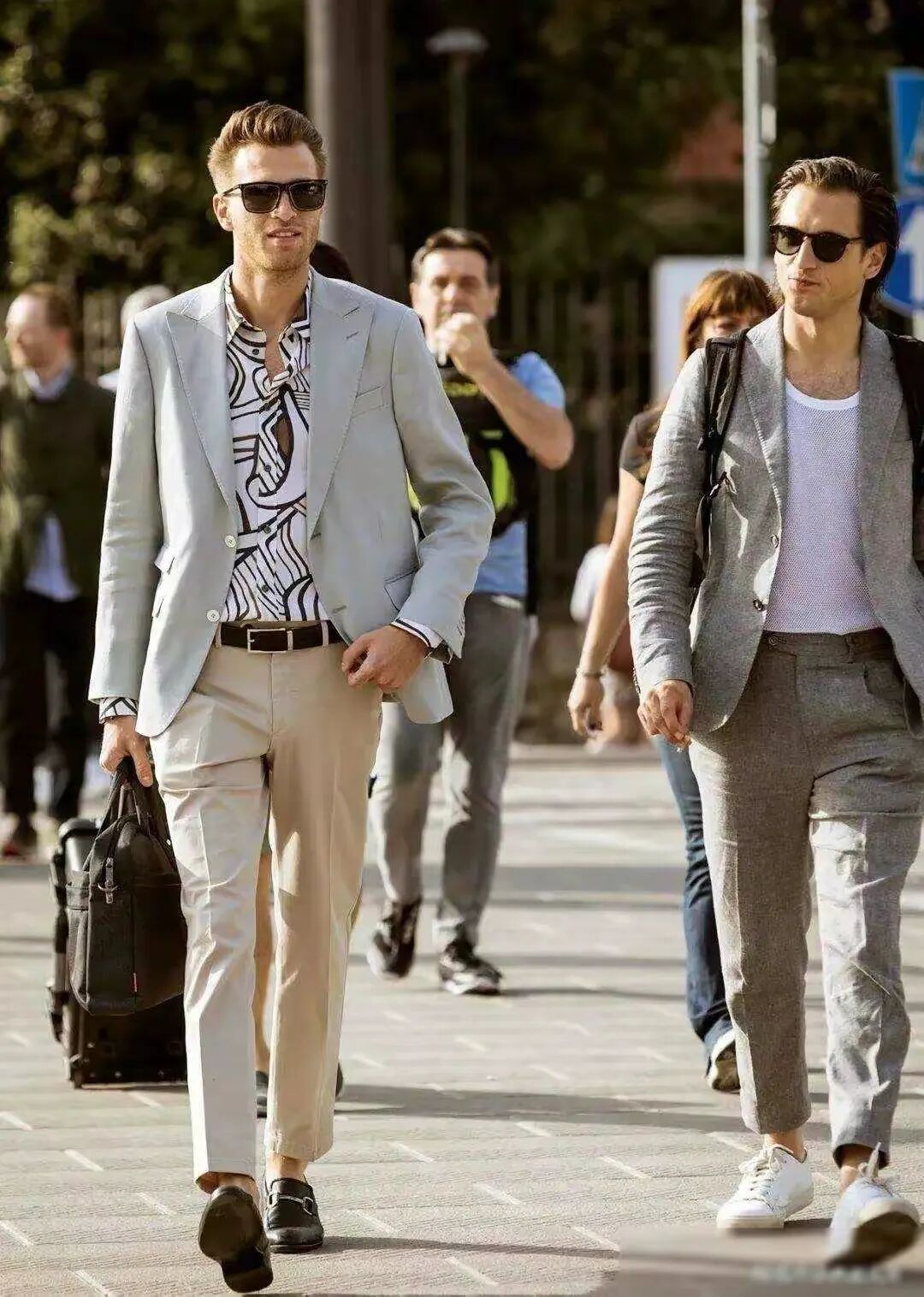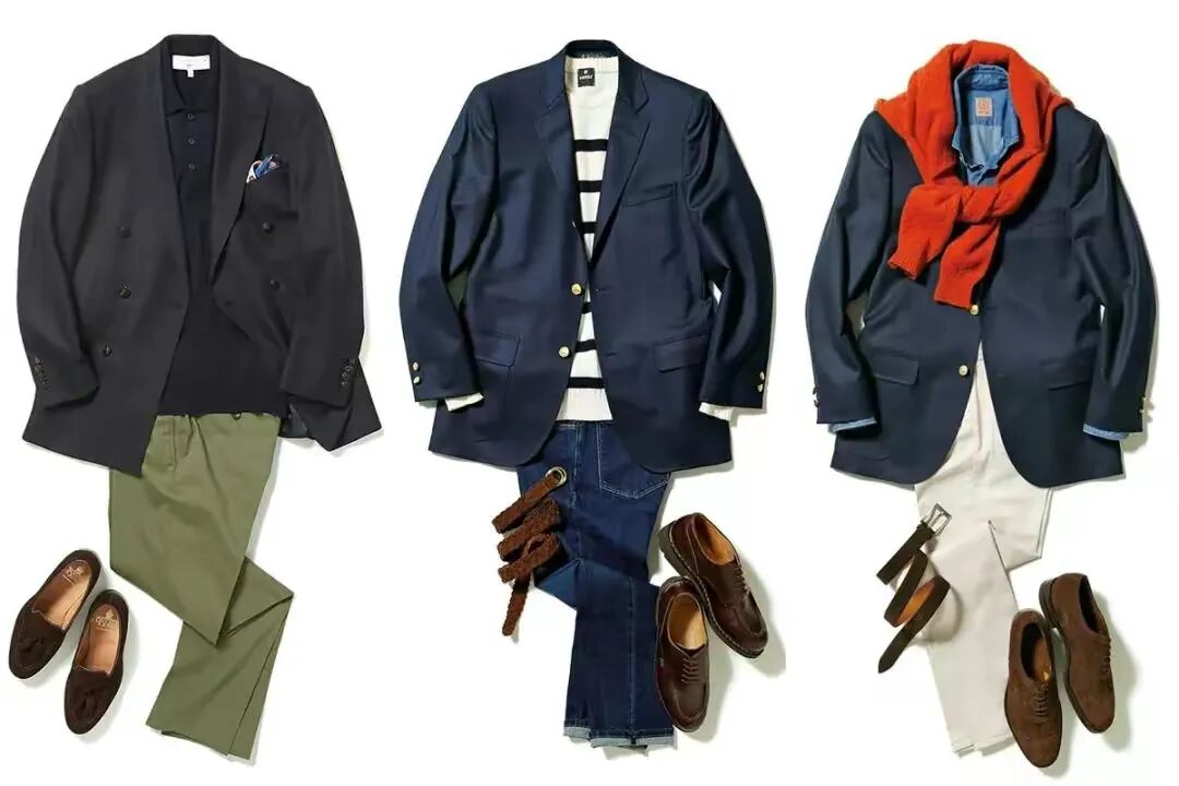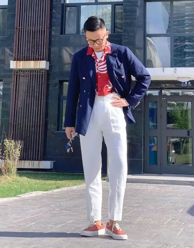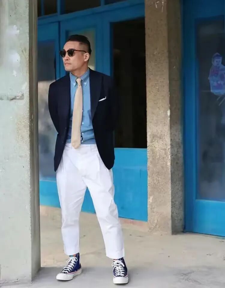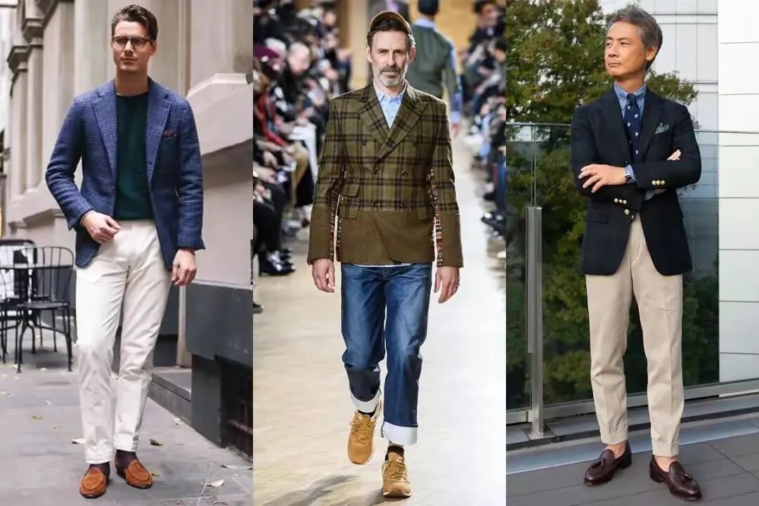 鞋履的选择也是整体造型的关键。休闲西装可与皮鞋、休闲鞋或运动鞋巧妙搭配。皮鞋适合正式场合,