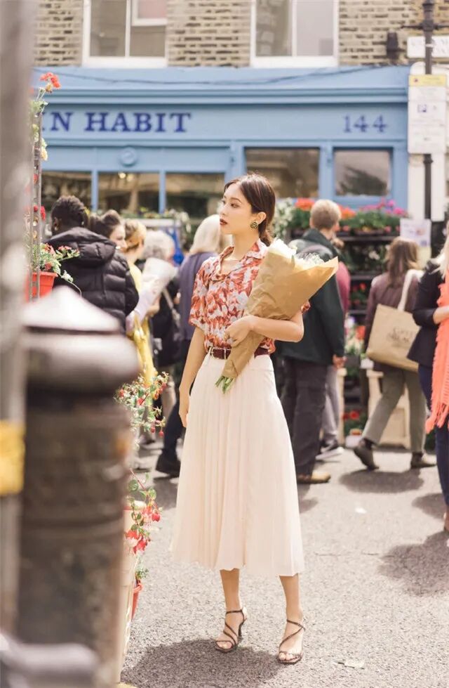 衬衫+半身裙的搭配不想土气的话,那么试试搭配一条腰带,很有美国二三十年代的“赫本风”味道,非常时髦,而且还可以提升整个搭配的精致感。