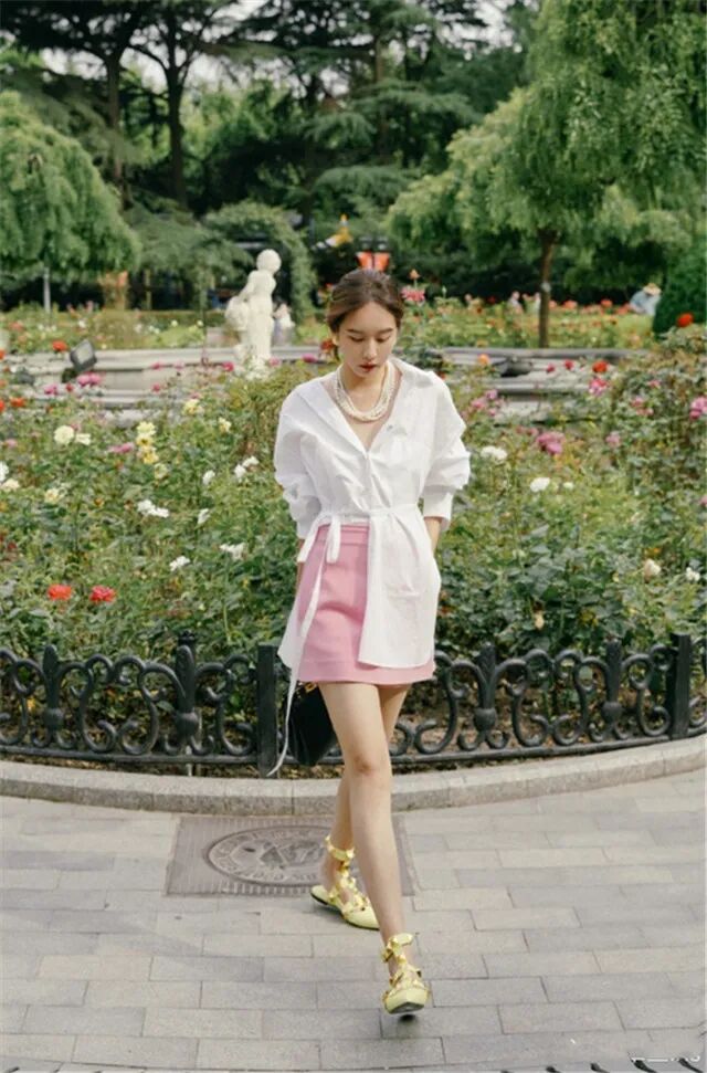 夏季穿靴子会很闷热,虽然很好看,但是也有点不现实,穿出门是绝对不可能的,肯定出一脚的汗。所以不妨试试搭配高跟鞋或者小白鞋,更加实在。我们的衬衫的白色也分了好多了,珍珠白就是一种高级又女性化的颜色,穿上就很高端,而且不容易撞色哦。