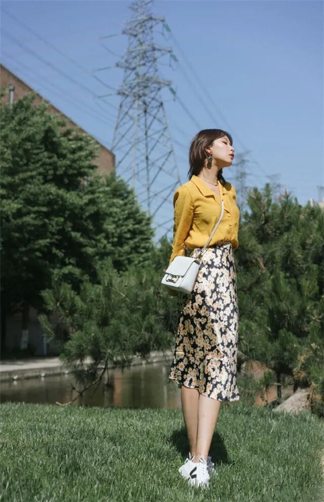 1:姜黄色衬衫+碎花裙+小白鞋