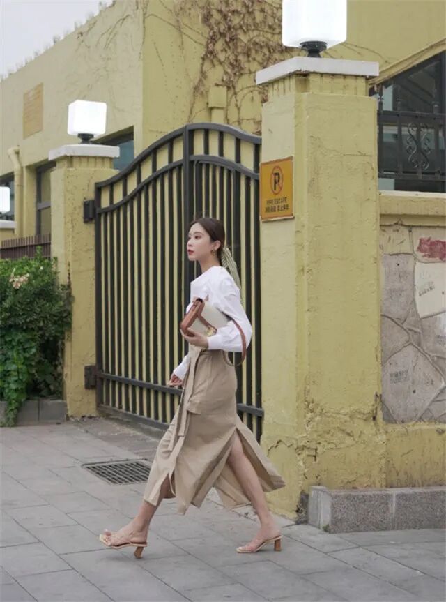 2:白色衬衫+卡其色开叉半身裙+高跟鞋