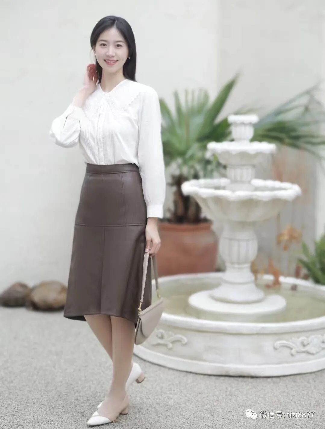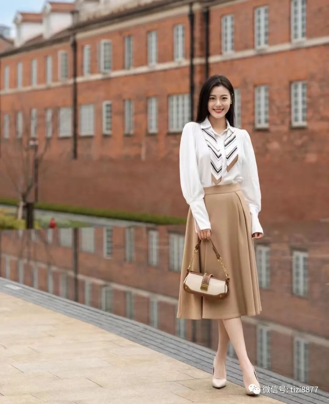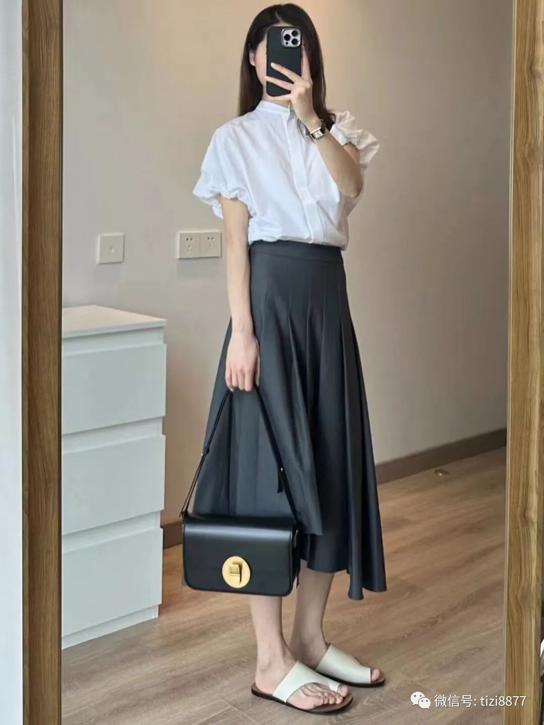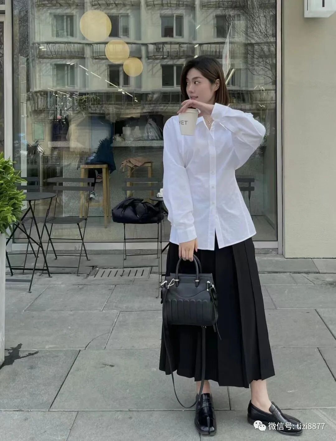 白衬衫+百褶裙法式黑白配:白衬衫怎么穿都好看,一点小心机收腰显瘦,搭配百褶裙简单又高级,包包也选择了黑色有质感的款式,无论是通勤还是逛街背都合适。