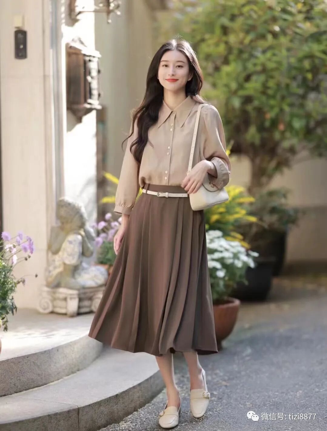 五月就这样从鲜花绽放中开始了,穿了棕色系的衬衫与半裙,整体有种文艺感,还带点书香气质,是看不腻的优雅与温柔呀。